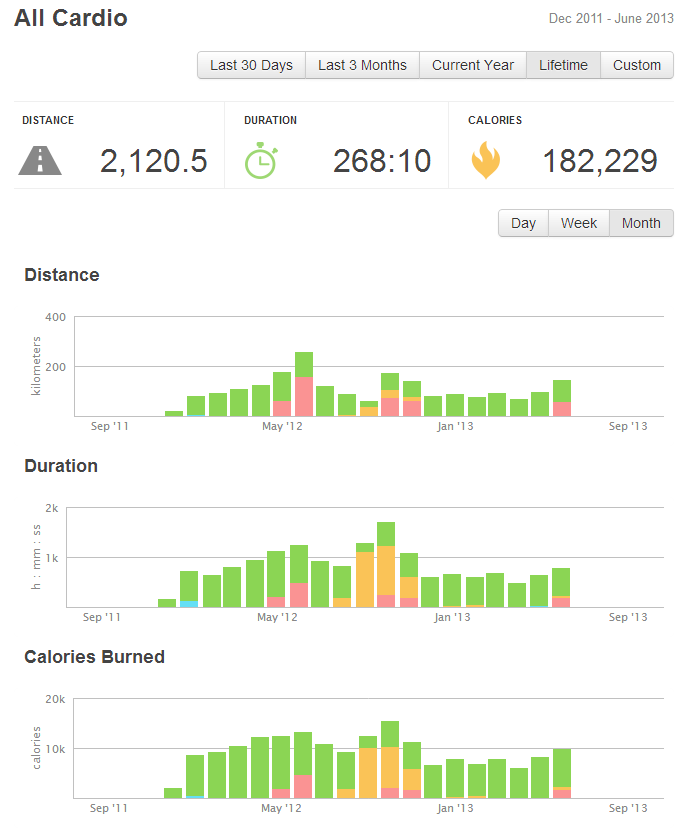 Here’s my life-to-date Cardio report card. I was hoping that I can complete 400 hours of exercise by end of the year, but that looks like an impossible target unless I start exercising every day for an hour!