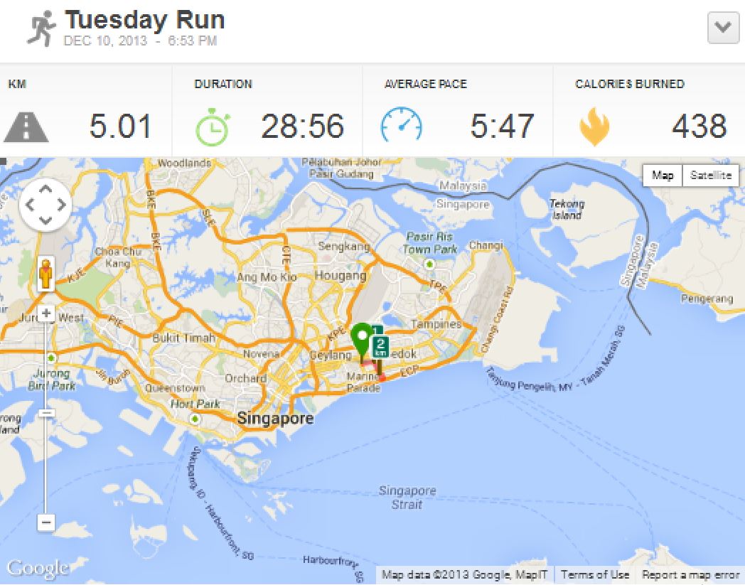 Since then, it has been a regiment to run at least thrice a week. At one period, I just keep on running on alternate days, and when I got injured in 2012, I told myself I had to augment my routine with swimming and cycling, which I did subsequently. 24 months later, I can fairly say that there has been a tremendous progress made, whether it’s physically (8″ slimmer and 15kg lighter), pace and timing (4 min/km faster) or health wise (more focused with fewer MC taken). I did a similar run this morning, through the same route as I did on my first run 24 months ago, and the result was sobering.