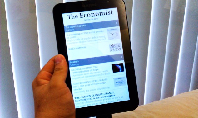 Coming back to my original intent of getting the tablet, e-Reading, I was so pleased when Amazon recently updated their Kindle for Android app to support both magazine and newspaper. If you recall, magazine and newspaper e-reading was my main reason for getting a tablet to compliment my Kindle device. I was shocked when I first found out that the older version of Kindle for Android app could only support e-books (i.e. not magazine or newspapers). So the update was very timely, at the time when I got the Tab. With a 7″ Tab, a perfect size for e-reader in my opinion, I can now enjoy reading The Economist and Herald Tribune on my Tab, in full color — but only when my wife is not playing her Angry Bird and the likes. 🙂
